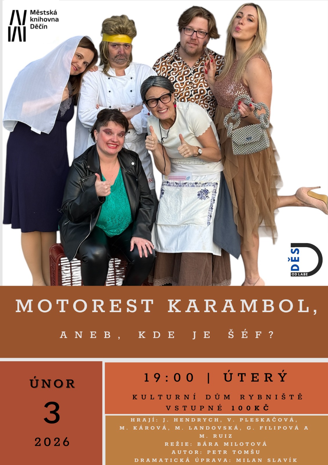 Děčínský divadelní spolek Děs od Labe vás zve na malou oddechovou komedii s detektivní zápletkou - MOTOREST KARAMBOL, aneb Kde je šéf?