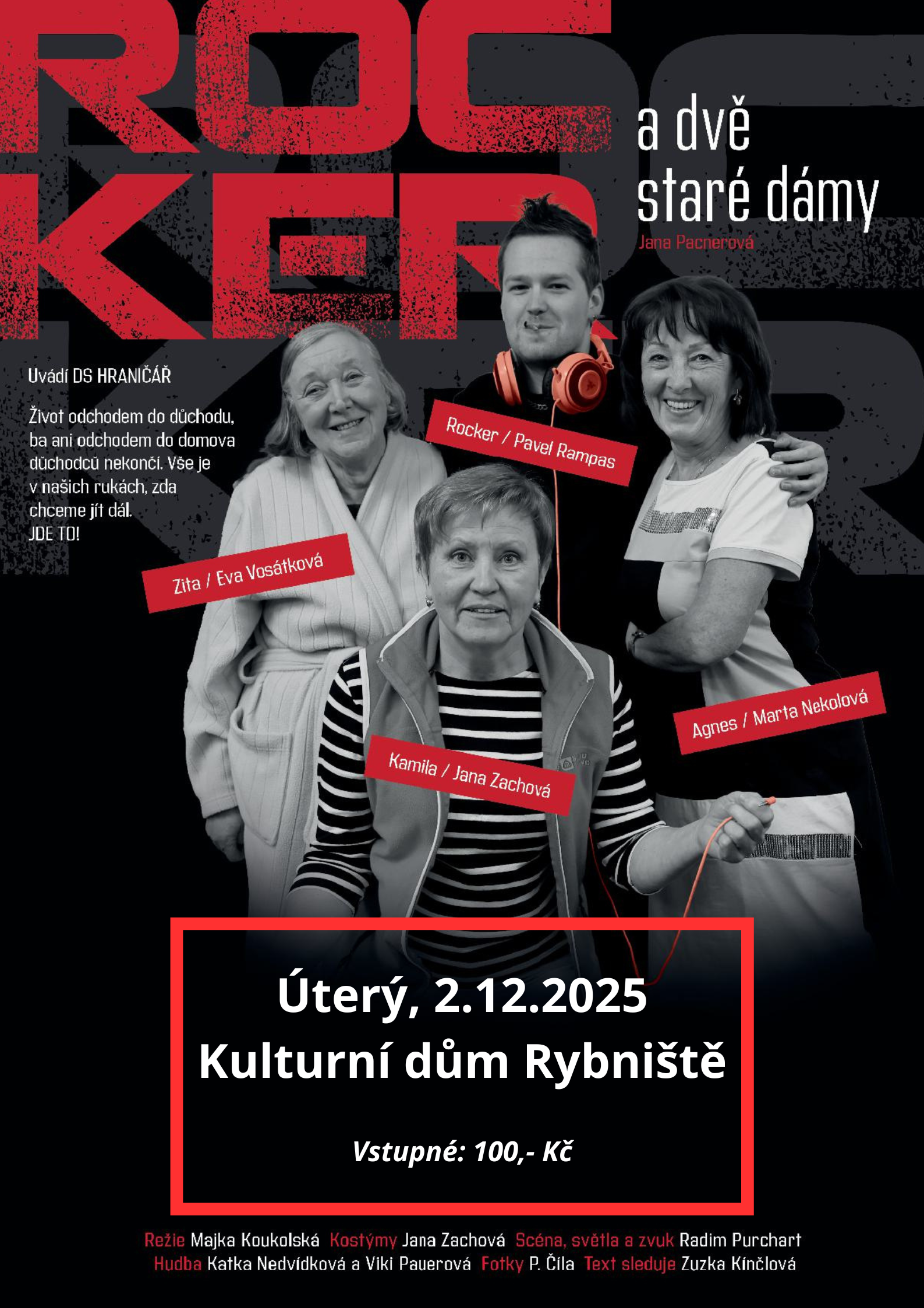 Na "prknech", co znamenají Rybniště, znovu přivítáme divadelní soubor Hraničář. Hru ROCKER A DVĚ STARÉ DÁMY představí v úterý 2.12.2025 od 19 n.