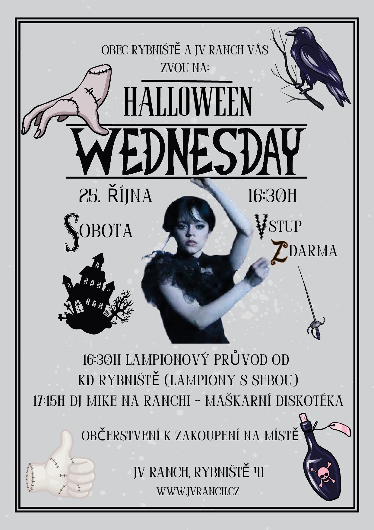 Ve spolupráci s JV Ranch zveme na další halloweenskou párty - tentokrát na téma Wednesday. Lampiónový průvod a dětská maškarní diskotéka na ranči. Průvod začíná v sobotu 25.10. v 16:30 hodin.
